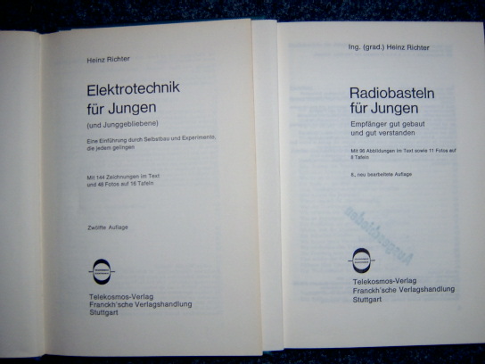 Bücher? Bücher! In Arbeit...Alte Bücher, die immer noch begeisternNachdem ich mit 12 Jahren die kleine Stadtbücherei in meinem damaligen Wohnort Erbach im Odenwald für mich entdeckt hatte wurde sie ausgiebig genutzt. Neben Abenteuerromanen waren Physik und Technik weitere Themen. Ein Beitrag in der Zeitschrift "Rassselbande" (Bau eines Detektorempfängers) und Empfangsversuche mit dem Radio meiner Eltern infizierten mich für die Radiotechnik und als Folge davon für den Amateurfunk. Mit Hilfe dieser Titel, die ich geradezu verschlang, lernte ich viel über Elektrizität, Funk- und Radiotechnik. Denn ich wollte die fasziniernde Technik verstehen! Das Begreifen und Lernen brauchte Jahre, erfolgte spiralig und mir gingen nach und nach viele Lichter auf :-)Einige der Bücher besitze ich inzwischen selbst und lese immer noch gerne darin. Für die Ausbildung im Amateurfunk (Grundlagen der Elektro- und Radiotechnik) ist der Inhalt immer noch aktuell. Leider gibt es Bücher dieser Machart schon lange nicht mehr. Büscher, Elektrotechnik in Bildern , 8.